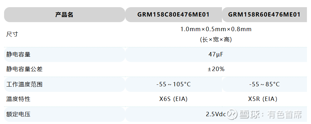 从具体参数来看,以村田2025年7月宣布量产的0402英寸(1.0mm×0.5mm)、容值高达47 µF的MLCC(GRM158C80E476ME01 / GRM158R60E476ME01)为例,这是当时业内最早面市的小型化大容值MLCC,工作温度高达105°C,能够置于芯片附近,特别适合数据中心(包括AI服务器)等高性能IT设备,以及多种民用设备。其规格参数如下图。