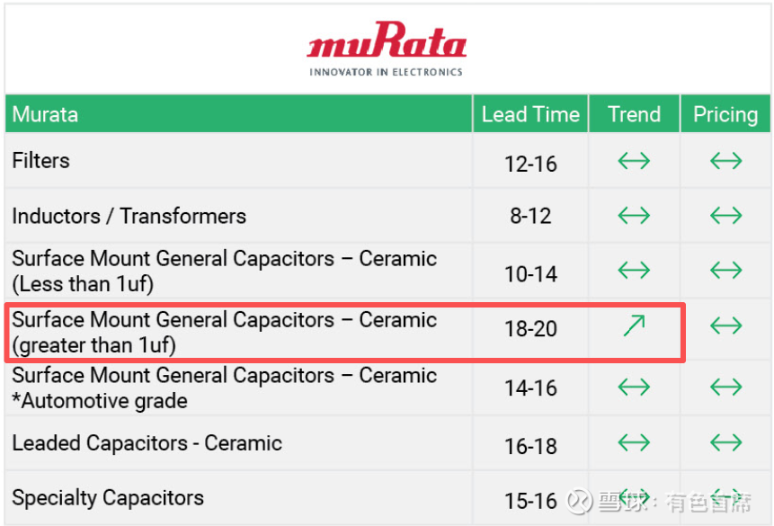 根据富昌2025年Q4市场行情报告,村田贴片通用型陶瓷电容(1 µF 以上)的交期在18-20周,有延长趋势。不过,这一分类覆盖面较广,真正用于 AI 服务器的是其中具备更高耐压和可靠性要求的高端规格型号。
