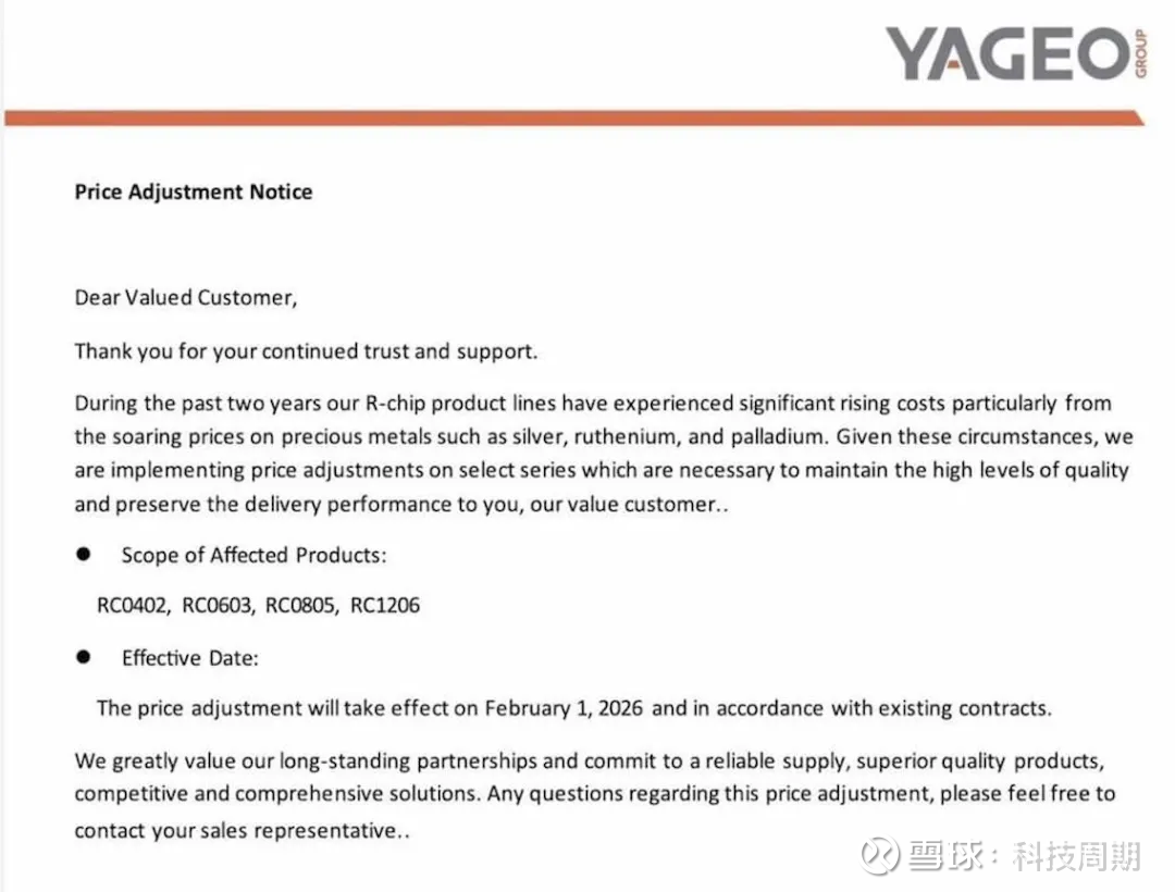 国巨发最新的涨价通知表示,由于芯片产品线成本显著上涨,尤其是贵金属如白银、钌和钯的价格飙升,决定从今年2月1日起,对部分电阻产品进行价格调整,调涨幅度约15%-20%,受影响产品涵盖RC0402、RC0603、RC0805、RC1206等电阻产品。