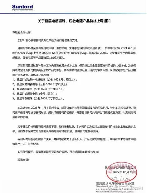 而在2025年12月底,顺络电子也率先发布涨价通知,表示将自2026年1月1日起对部分电感磁珠、陶瓷电感、功率电感、压敏电阻及车载磁珠产品进行价格调整。