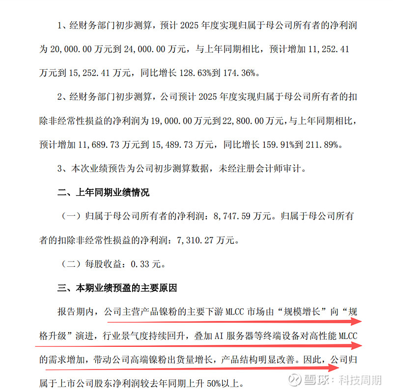 这两日刚出的公告,一个火炬电子,一个博迁新材。原文:报告期内,公司主营产品镍粉的主要下游MCC市场由“规模增长”向“规格升级”演进,行业景气度持续回升,叠加AI服务器等终端设备对高性能MLCC的需求增加,带动公司高端镍粉出货量增长,产品结构明显改善。因此,公司归属于上市公司股东净利润较去年同期上升50%以上。公司所处的电子元器件领域迎来积极转变,行业景气度稳步提升,为公司的业务发展营造了良好的外部条件。