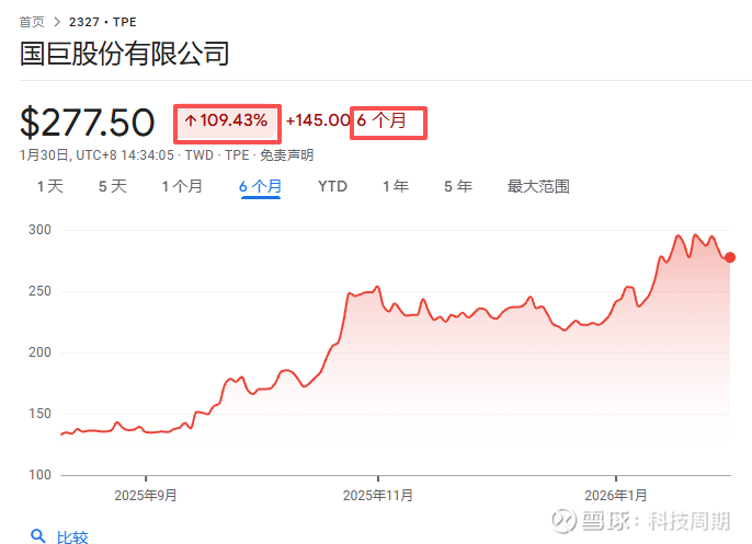 国巨股份有限公司,台湾的电子元件制造商、第一家股票上市的被动元件厂。从2025年8月到现在涨幅为109%。国巨为全球芯片电阻第一大厂,全球市占率约34%、亦为全球钽质电容第一大厂,全球市占率约46%,并为全球陶瓷电容第三大厂,全球市占率约15%,以及全球电感第三大厂,全球市占率约12%。