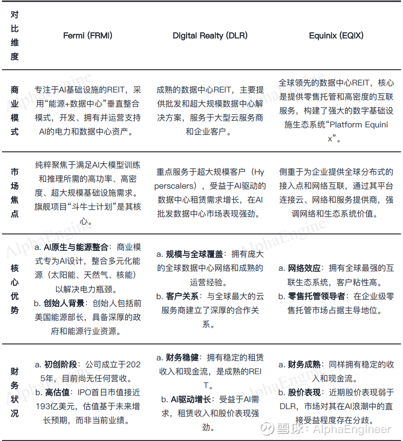 Fermi的主要竞争对手是 Digital Realty (DLR)和Equinix (EQIX)这两大成熟的数据中心REITs巨头。