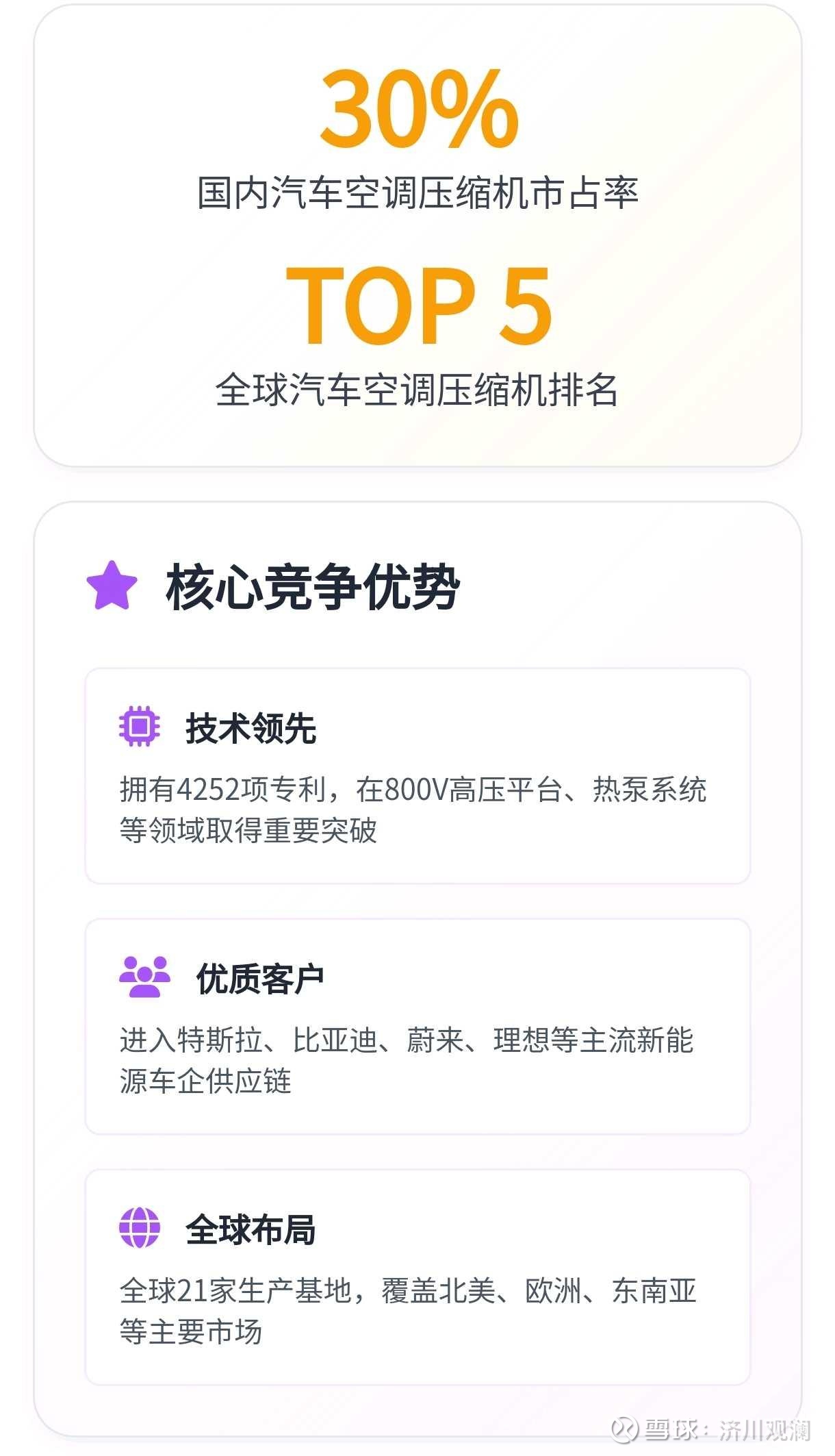 它是汽车空调压缩机国内市占率30%、全球排名第五的“隐形冠军”,2024年电动压缩机销量达707万台,新能源业务收入占比超40%,还绑定了特斯拉、比亚迪等头部车企。