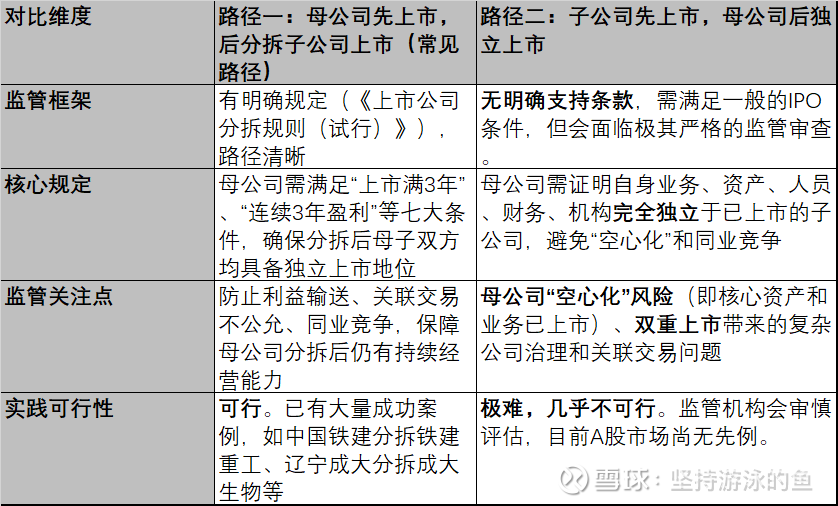 根据你的表述,我查阅了相关的法律法规。简单来说,您的理解基本正确,但结论略显绝对。当前A股市场的监管框架和实践确实使得母公司独立上市的难度极高,但《公司法》本身并未明文禁止这一行为。限制主要来自于中国证监会的具体上市监管规则。
