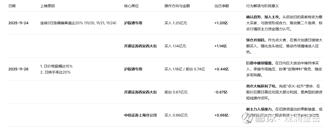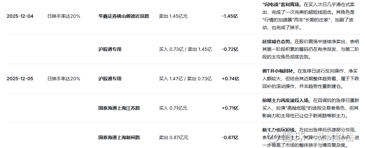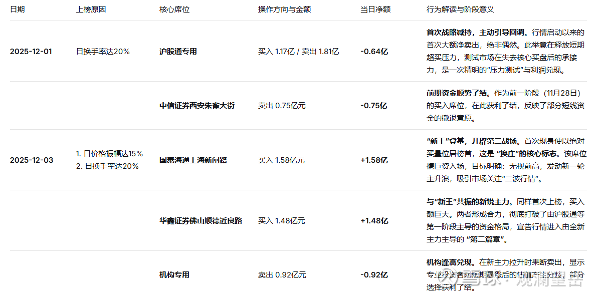 权力交接明确:以 12月1日沪股通大额净卖出 为序幕,以 12月3日国泰海通新闸路、华鑫佛山近良路巨量买入 为高潮,完成了行情主导权从第一阶段主力(外资/早期游资) 向 第二阶段全新主力(实力游资) 的转移。