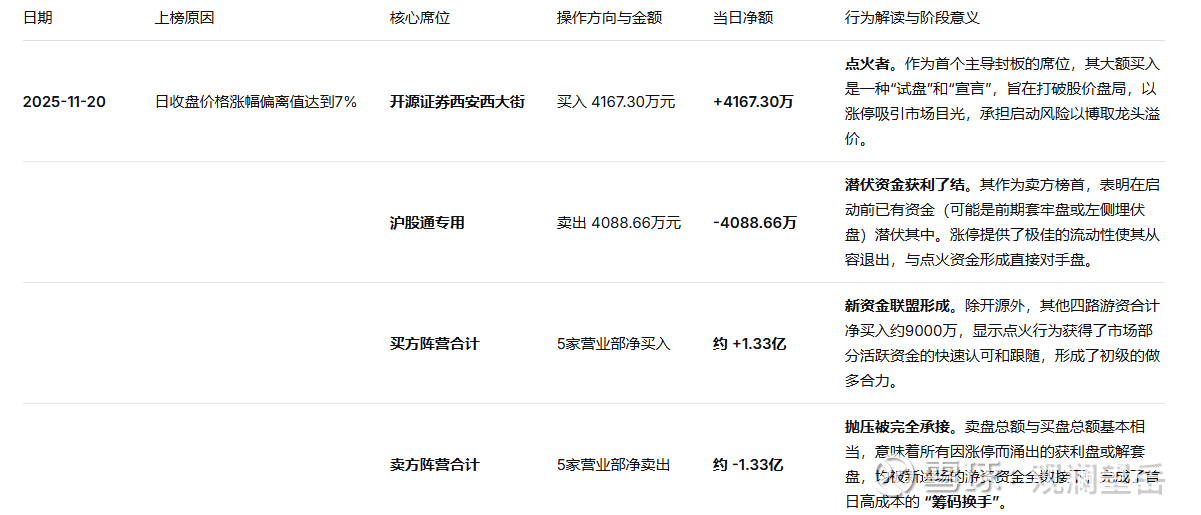 确立关注度:首次登上龙虎榜,意味着该股正式进入市场(尤其是短线投机者)的核心观察池,为后续吸引更多跟风盘、进行资金接力创造了必要条件。