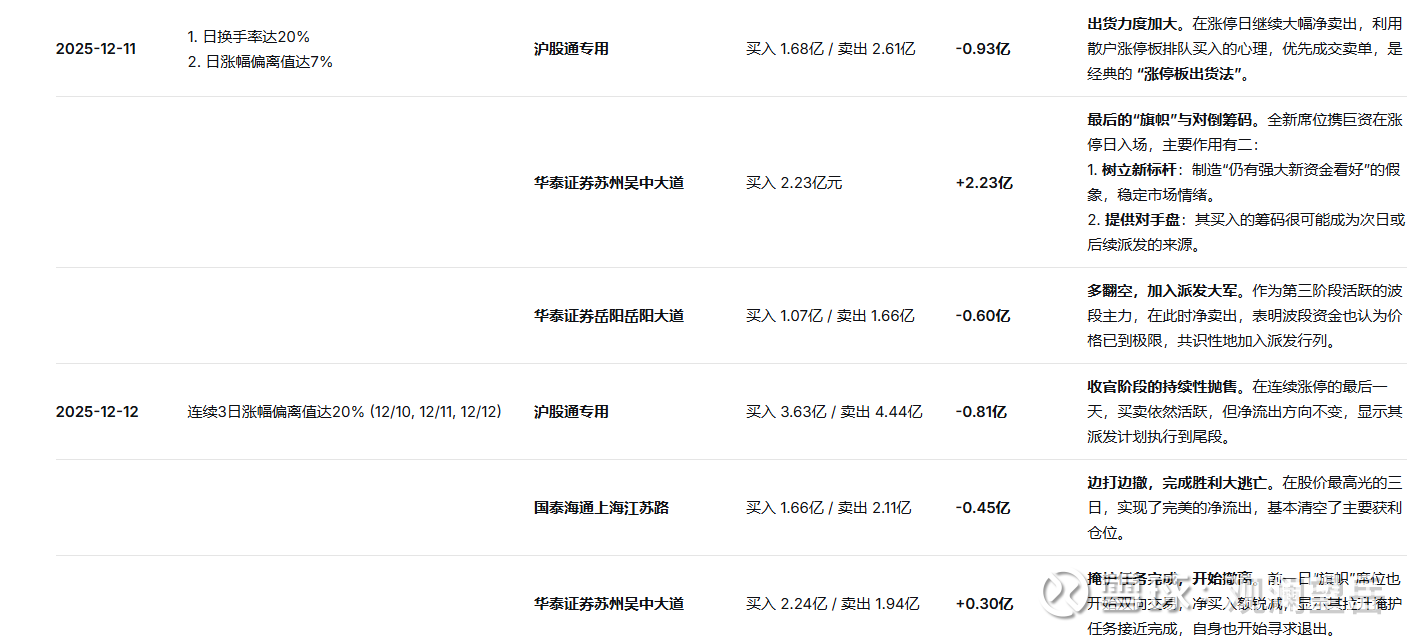 12月12日(三日榜):数据显示,所有早期的核心主力席位(沪股通、国泰海通江苏路、华泰岳阳大道等)全部为巨额净卖出。