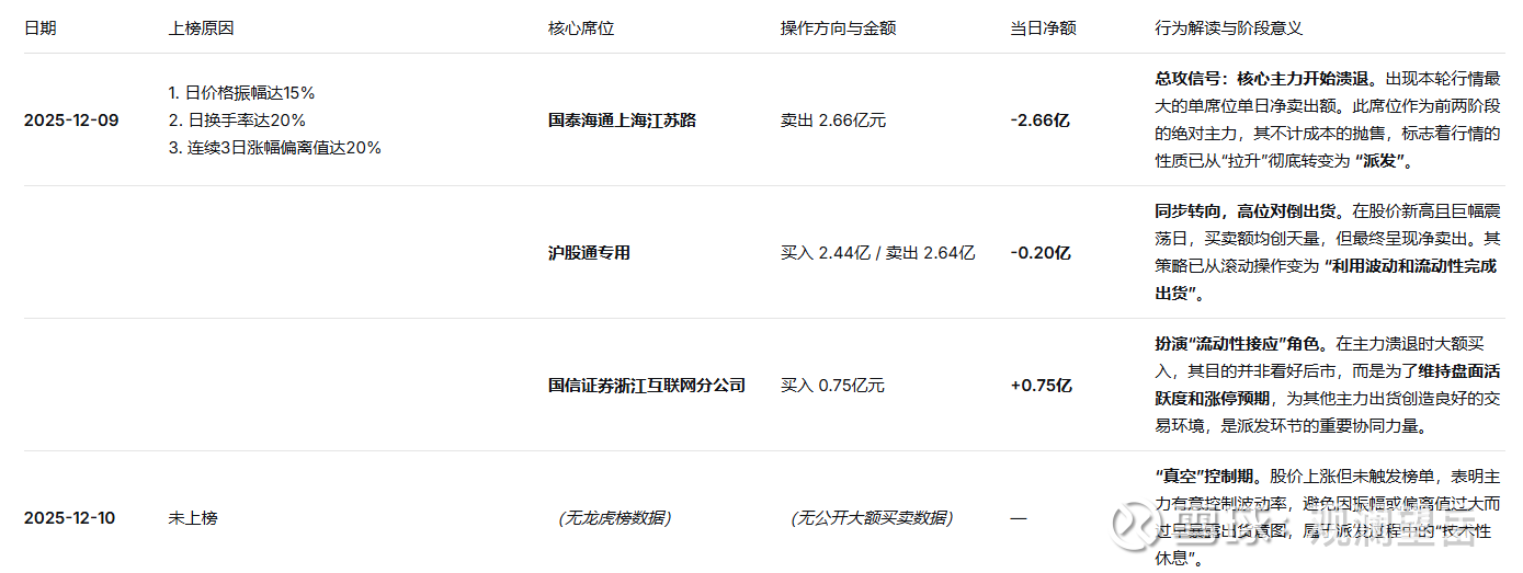 行情终局:随着最后一个交易日(12月12日)主要席位完成净卖出,本轮由多路资金精密协作的炒作周期宣告结束。后续股价一旦失去维护,将面临因主力缺失而导致的大幅回调。