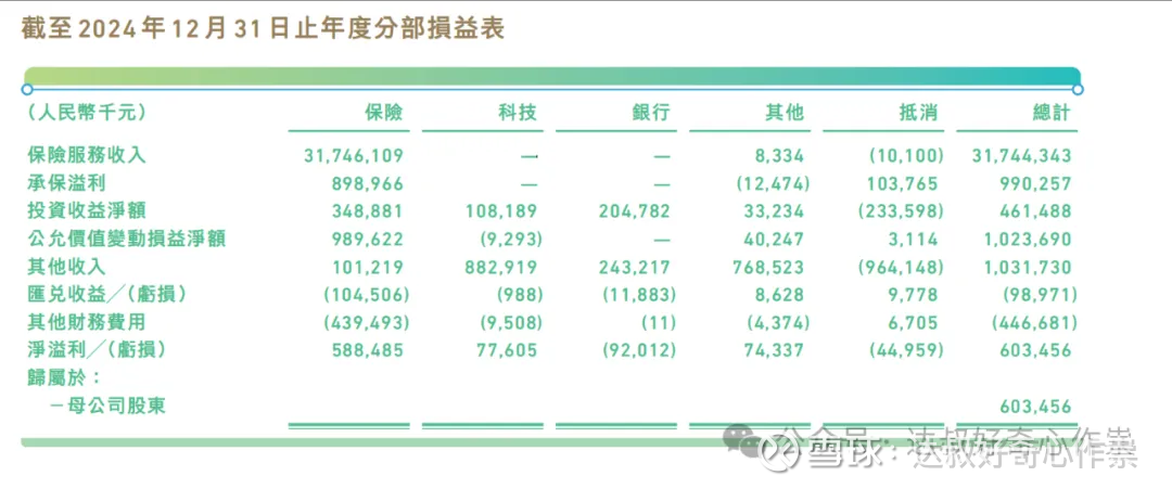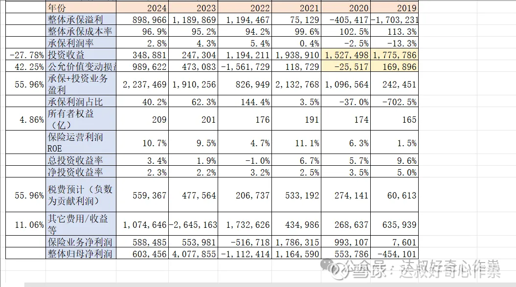 跟中国平安一样,公司整体主要利润还是由保险业务贡献,近3年公司保险业务承保利润也相对稳健,尽管2024年有所下降;而投资业务的收益受资本市场波动影响,一直都不大稳定。国内财产保险行业投资收益贡献险企整体利润大概在50%-70%,而对于美国的险企,投资收益占比高达70%-90%,是承保亏损的“稳定器。近三年众安保险承保利润占比运营利润(承保利润+投资收益+公允价值变动损益)的平均值为82.3%,对应投资业务相关的收益占比低于20%。