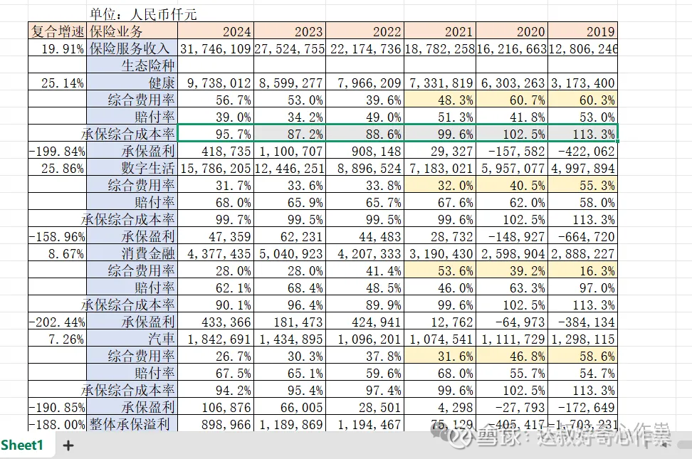 数字生活、消费金融、汽车等业态保单费用率处于可接受范围,数字生活的赔付率稍高一些,导致该业态的承保综合成本率(COR)接近盈亏临界点(100%)。2024年公司整体COR为96.9%,尽管较2023年(95.2%)上升1.7个百分点,但好于行业标准水平(国内财险行业COR加权平均值99.0%,中位数102.8%),并且保持连续四年承保盈利。