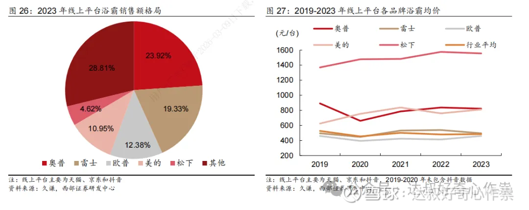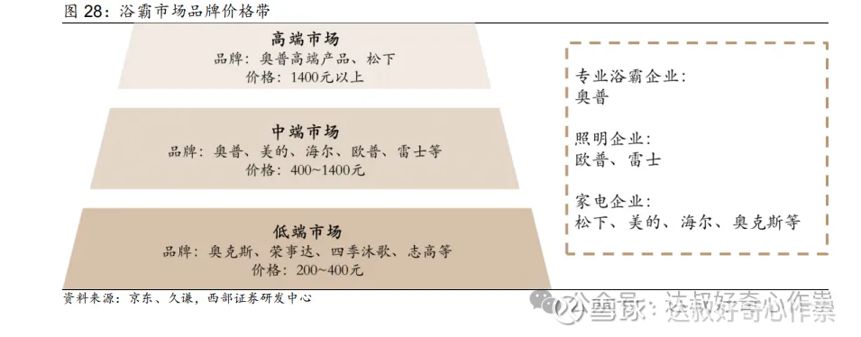 浴霸行业市场规模(包括零售、批发、工程等渠道)大概为80-100亿,据久谦数据,线上平台浴霸销售额份额中,2023年CR5为71.19%(2024CR5下降至58.9%,竞争加剧);但奥普的销售额市占率持续保持领先,2024年为22.3%。公司的浴霸产品主要针对中高端市场,平均售价高于市场平均水平,高端产品与松下产品在性能方面差异较小,都有均匀制热、大体量换气和除菌、智能控制等功能;且部分性能超越松下,如换气量更大、除菌率更高及拥有均匀制热专利等。与其他竞争品牌参数相近的产品对比,奥普基础功能的浴霸制热速度、风速等性能均领先,同时也具有一定品牌溢价。