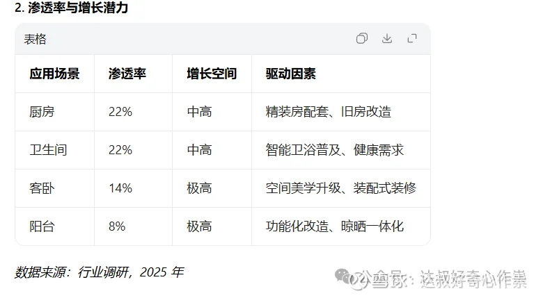 集成吊顶行业是现代家居装修的重要组成部分,它将吊顶基板与取暖、照明、换气、音响等功能电器模块化组合,提供美观、便捷的一体化解决方案。根据中国建筑装饰协会调研的数据,国内2025年集成吊顶的市场规模约480亿元,但行业进入门槛和生产壁垒较低,超1000家企业竞争,TOP10市场份额仅20%-30%,集中度仍有提升空间。集成吊顶当前主要应用场景是在厨房和卫生间,奥普进入该行业具备业务协同优势,吊顶品牌已与“浴霸”品类深度绑定。