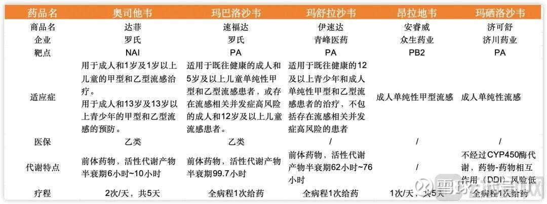多款流感药物特性对比,数据源自摩熵医药