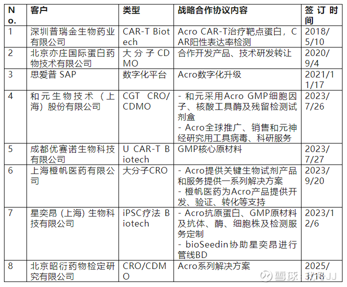 据可查询的数据,Acro从2018年至今共签订了8个战略协议。其中3家CGT Biotech,4家CRO/CDMO以及1家企业数字化平台。Acro的发展脉络也能从其签订战略协议的公司看出来。在2022年之前,主要还是基于Acro的靶点蛋白优势来选定合作伙伴。而到了2023年,Acro的已经丰富了GMP因子、核酸酶及对应的残留试剂这类CGT核心原材料及检测产品线,于是可以和CGT类的CDMO以及CGT Biotech开展战略合作。要么是将其CGT原料嵌入CDMO平台,要么就是直接和CGT Biotech深度合作,总之原则是提前锁定需求。