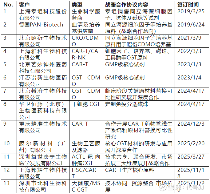 据可查询的数据,同立海源从2019年至今共签订了13个战略协议,属于当之无愧的战略协议之王。其签订战略协议的目标也非常明确,盯着3类公司:CGT Biotech、CGT CDMO以及细胞培养基厂商。这是由于同立海源起家就是做所谓CGT GMP核心原材料的,即细胞因子、磁珠以及培养基这些。既然是玩原料,那就得提前锁定需求,或者是让客户的平台都使用你的产品。基于此,同立海源和昭衍、江苏谱新以及北京希济这三家CDMO公司都签了战略协议,特别是谱新和希济,专注于CGT CDMO业务,那么将产品嵌入它们的细胞培养平台,项目来了优先使用同立海源肯定稳赚不赔。