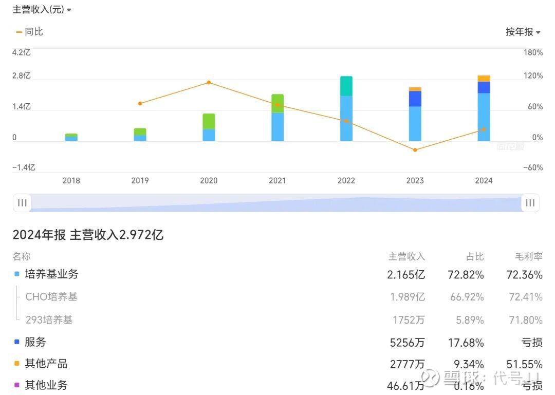 所以奥浦迈的业务模式非常简单,基于常见的CHO及HEK293等常见细胞平台提供培养基,以及从抗体药发现到细胞工艺提供全套CDMO方案,两者加起来就是Total Solution。近两年奥浦迈的培养基业务在Covid后还是稳步增长的(盘子仍然太小),但CDMO业务则出现了亏损,根据2024年报来看,主要还是接的项目少了,而运营成本又高企不下。