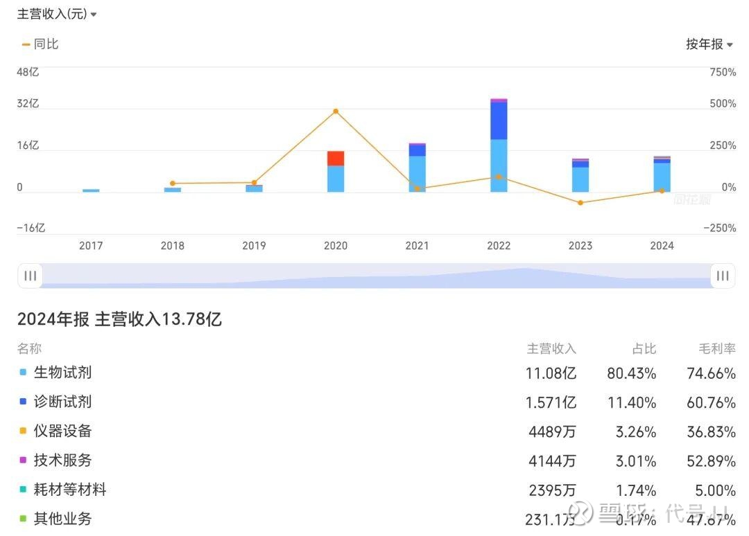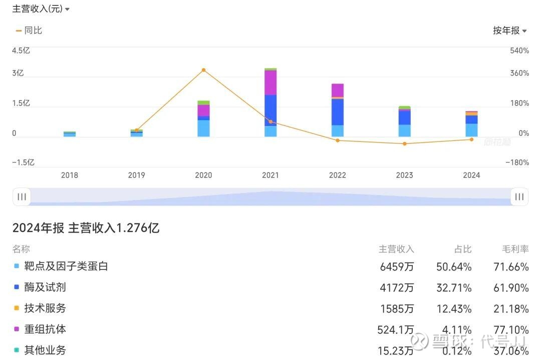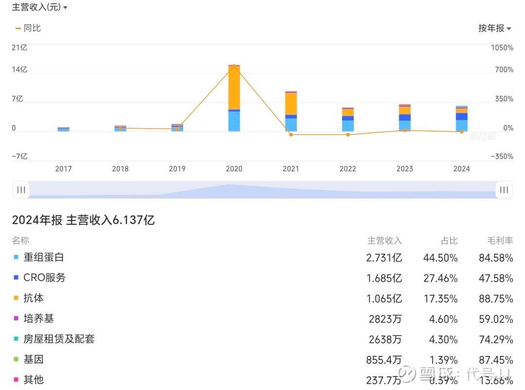 但义翘神州能够上市,完完全全就是因为Covid。在2019年前,义翘一年的营收也就一亿多点,苦哈哈的赚点碎银子,结果2020年靠着以Covid抗原蛋白及相关抗体为首的爆款产品,营收暴增到快16亿,之后逐年下跌,这两年算是企稳了。2024年义翘神州的海外营收约有3.5亿,占比快60%,但全年营收较2023年有所下跌,特别是抗体业务线可以说是暴跌了8000万。