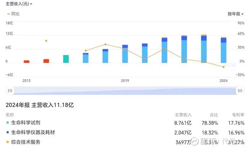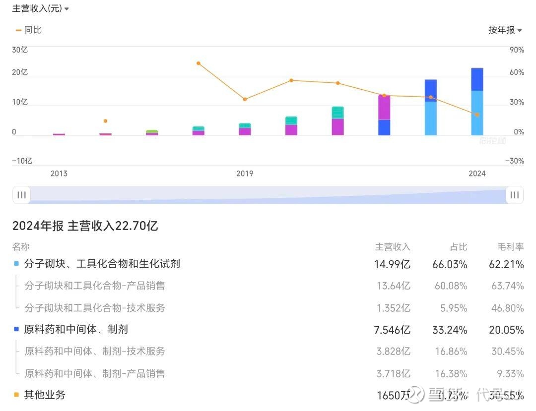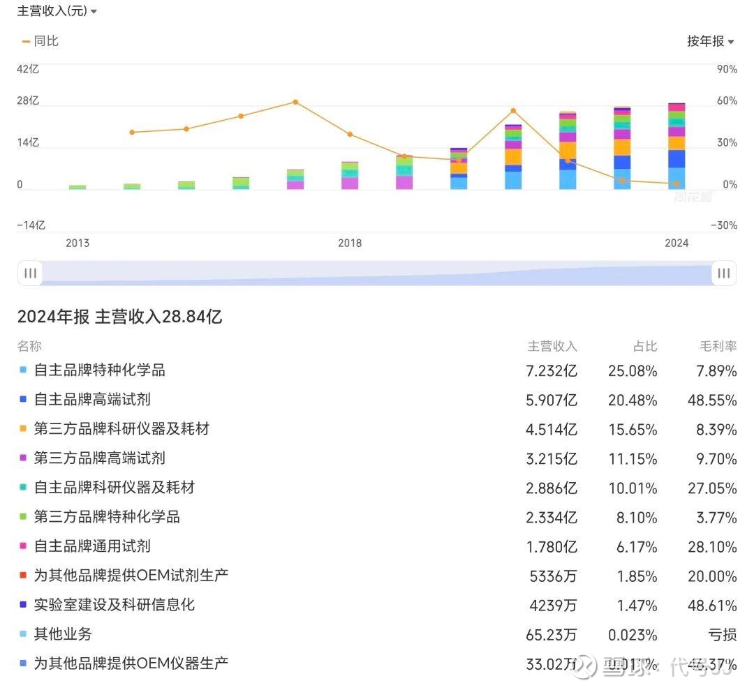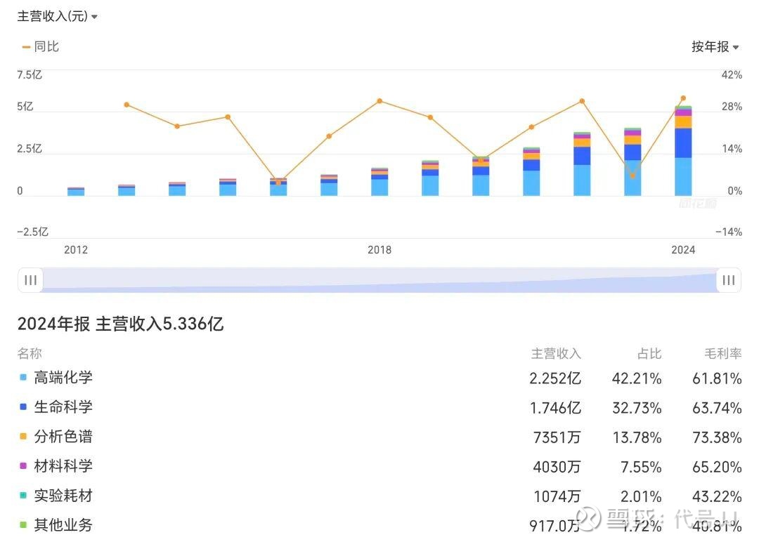 阿拉丁目前科研试剂业务分4块:高端化学、生命科学、分析色谱和材料科学,顺带着还卖点耗材。2024年总营收5.33亿,其中高端化学仍是主要收入来源,卖了2.23亿,占比42%,生命科学也卖了1.74亿,占比32.7%。不过阿拉丁2024年3月收购了上海源叶生物(主要是酶、抗体及蛋白等偏生命科学的试剂,2024年卖了一亿多),因此本年度收入是子母公司并表报告。总之目前来看,阿拉丁的营收和利润增长比较稳健,算是Fisher Scientific或Sigma的幼儿版状态,后续海外营收有待加强。