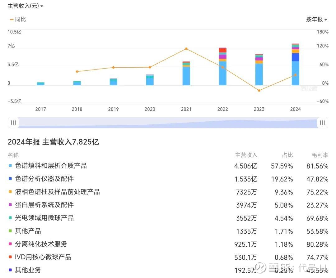 就近两年纳微科技的业绩来看,算是比较稳健,但远不如上市那会大家的想象。根据2024年报来看,7.8亿的营收中,广义的生物制药业务(蛋白层析+色谱分析)仍占到90%,而用于液晶面板领域的微球多年来一直稳定在3000多万,我猜测可能就那么几个稳定客户在使用。之前大家寄予厚望的IVD相关微球产品,在2022年高光后似乎也一蹶不振,在2024年仅有500多万的营收,甚至还不如纯化技术服务。