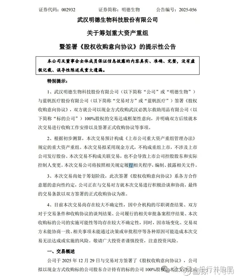 12月30日,明德生物(002932.SZ)与蓝帆医疗(002382.SZ)分别发布提示性公告,明德生物拟收购蓝帆医疗全资子公司武汉必凯尔救助用品有限公司(下称“必凯尔”)。此次交易中,明德生物作为买方,将通过收购全球应急救护细分市场领导者必凯尔,进一步延伸业务边界、完善产业链布局、提升资产质量与盈利水平;蓝帆医疗则借此机会盘活优质资产,持续聚焦核心业务发展。本次交易有望成为拓宽明德生物未来成长路径的战略性并购。