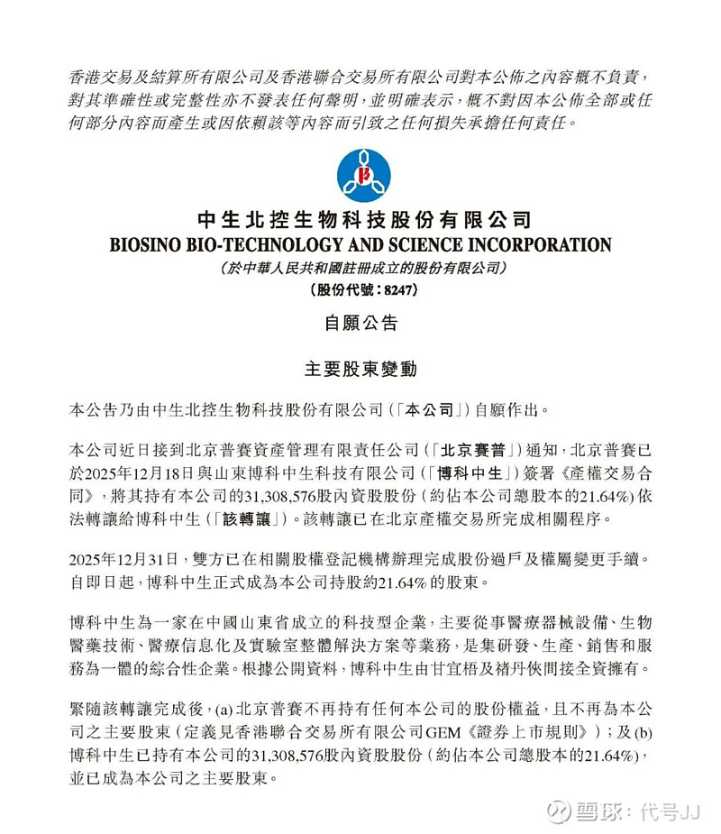 近日接到北京普赛资产管理有限责任公司通知,北京普赛已于2025年12月18日与山东博科中生科技有限公司签署《产权交易合同》,将其持有本公司的31,308,576 股内资股股份(约占本公司总股本的21.64%)依法转让给博科中生。该转让已在北京产权交易所完成相关程序。