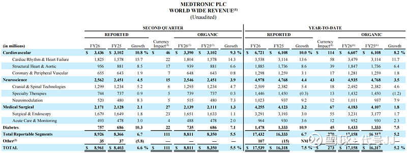 11月18日,美敦力披露了2026财年第二季度报告(截至2025年10月24日)。