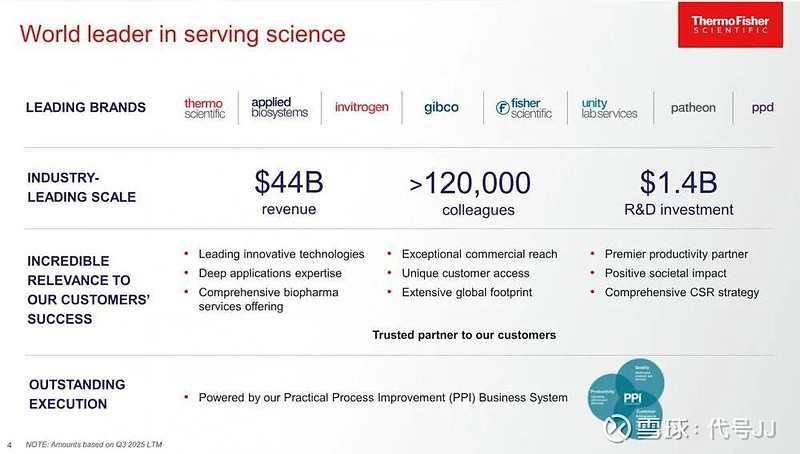 作为全球科学服务领导者,赛默飞年收入达440亿美元,年研发投入约14亿美元,服务四大终端市场(制药与生物科技占比56%)。公司所处市场规模2700亿美元,份额约20%,受益于老龄化、精准医疗等长期趋势,增长动力强劲。