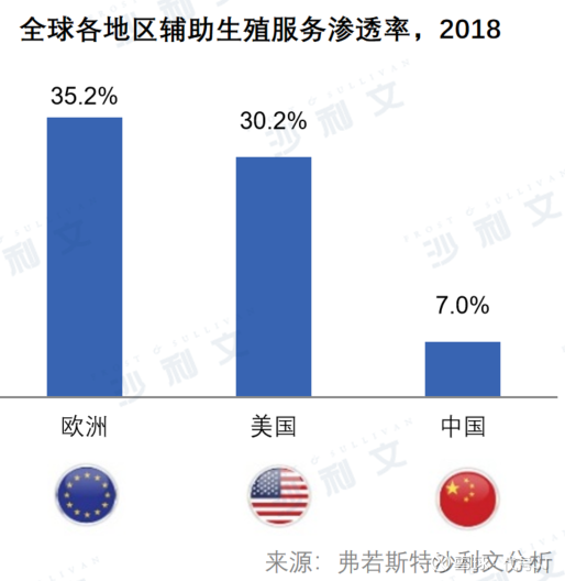 全球辅助生殖服务渗透率在不同地区存在明显差异。欧洲和美国由于对辅助生殖服务的社会接受度较高及政策支持较完善,ART渗透率明显高于中国。2018年欧洲和美国辅助生殖渗透率分别为35.2%和30.2%,中国仅为7.0%。