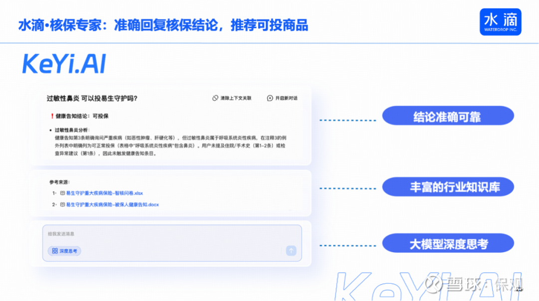 值得注意的是,水滴也在通过AI技术开放实现共赢,推动保险业形成更完善的科技生态。其自研的AI核保专家“KEYI”不仅能以SaaS服务的方式快速部署,还能根据合作方需求提供定制化方案,配置时间最短仅需3天。据结果验证,大型保险经纪公司引入后,新人从业培训效率提升了3倍以上,客户咨询也能在平均50秒内得到解答,显著提升了服务体验。同时,普通用户也能通过“KEYI.AI可依”微信公众账号进行体验,在对话框内输入相应的问题,即可获得快速回复。
