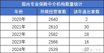 在机构数量上,2019年至2024年,我国保险专业中介机构法人数量分别为2642家、2640家、2610家、2582家、2566家、2539家,呈逐年下滑态势。也就是说,过去6年间,已有103家保险专业中介机构退出市场。同时今年三季度以来,已有163家保险中介机构退出市场,数量远超去年全年。