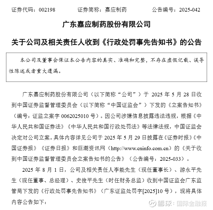 8月4日,广东嘉应制药(002198)发布一则行政处罚事先告知书。