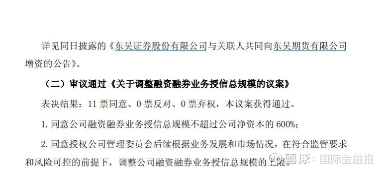 东吴证券公告称,董事会同意将融资融券业务授信总规模调整为不超过净资本的600%,即净资本的6倍。