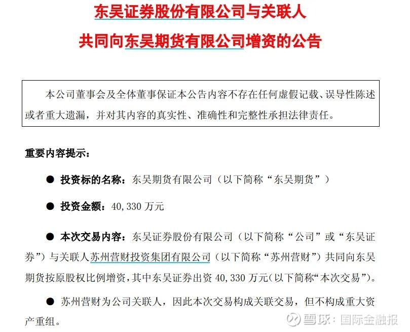 据公告,东吴证券拟以自有资金与关联人苏州营财投资集团有限公司及非关联人苏州交通投资集团有限责任公司共同向东吴期货按原股权比例增资,其中东吴证券出资4.03亿元,合计增资5亿元。
