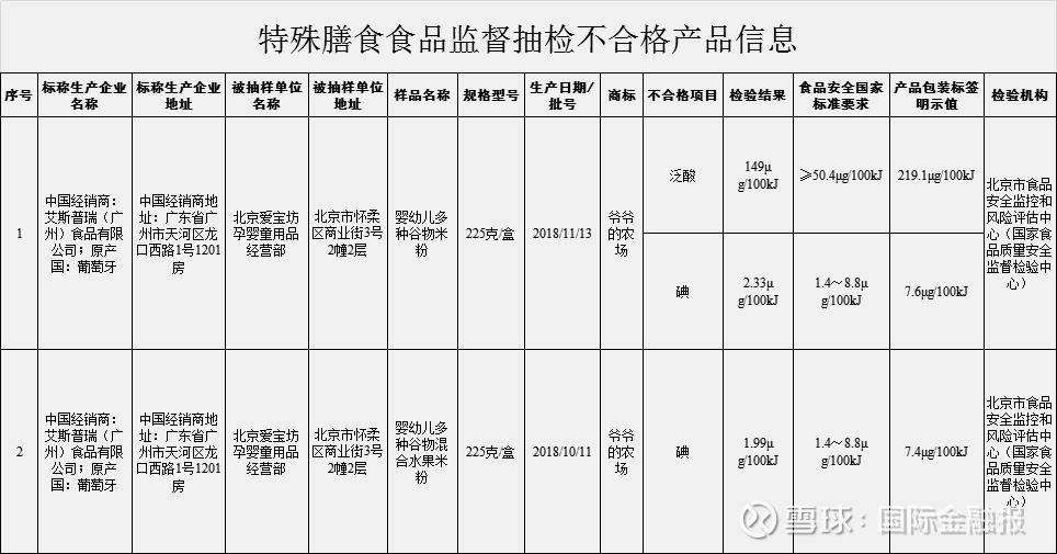2020年5月,爷爷的农场又一次被检测出婴幼儿多种谷物米粉(原产国:葡萄牙)、婴幼儿多种谷物混合水果米粉(原产国:葡萄牙)碘检出值低于产品包装标签标示值的80%。