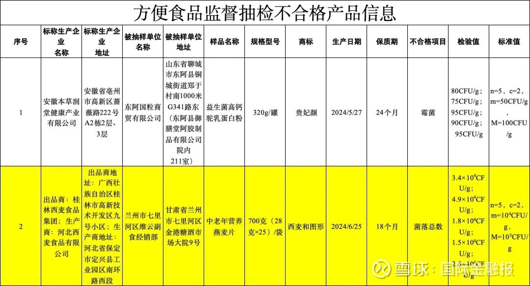近日,国家市场监督管理总局发布最新一期食品安全监督抽检结果,在对2136批次样品的抽检中,共检出40批次样品不合格。其中,西麦食品旗下、由河北西麦公司生产的“中老年营养燕麦片”被抽检出菌落总数不符合食品安全国家标准规定。