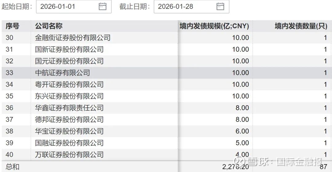 2026年开年,券商发债节奏明显加快。1月1日至28日,已有40家券商累计发债2278.2亿元;而2025年同期发债规模仅739亿元,同比增幅超200%,“开门红”特征明显。