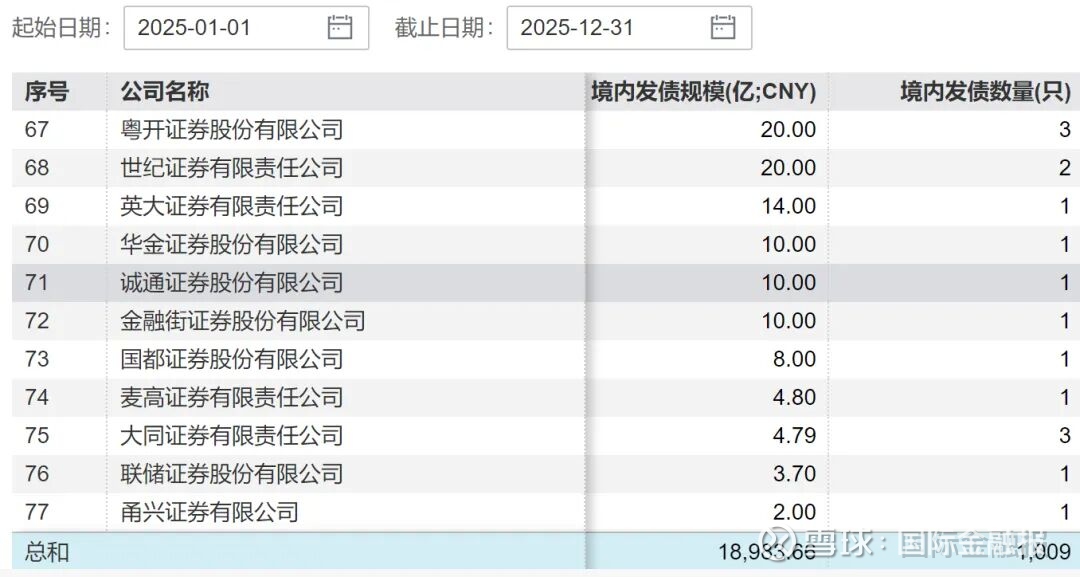 Wind数据显示,2025年77家证券公司合计发行境内债券1009只,总规模达1.89万亿元,创历史新高。与2024年同期的1.36万亿元相比,2025年境内发债规模同比增长近40%。