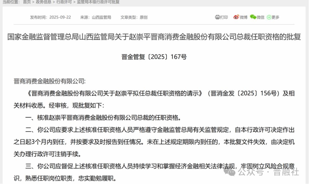 9月22日,据国家金融监督管理总局山西监管局消息,山西多家金融机构高管任职资格获核准,其中包括晋商消费总裁任职资格正式获批,以及工行、农行、建行等高管任职获批。具体来看: