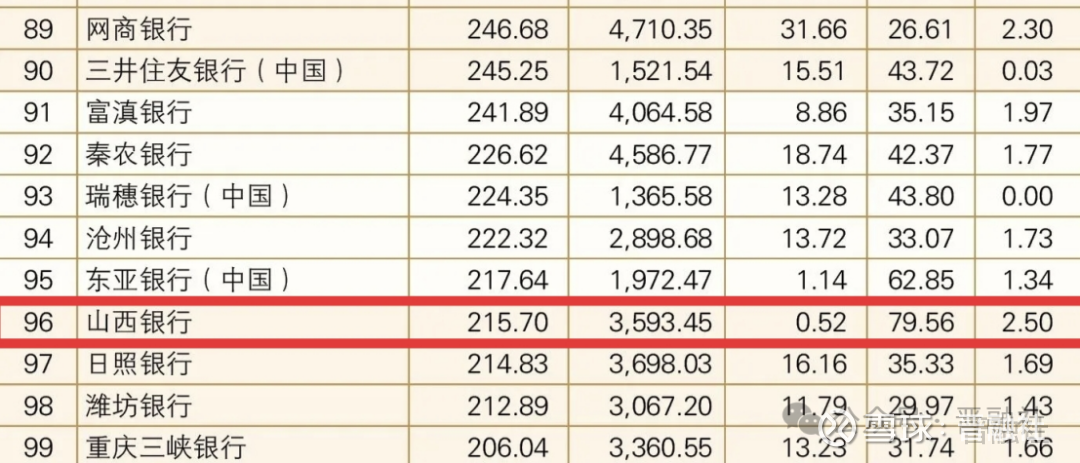 山西银行的核心一级资产净额为215.70亿元,资产规模为3593.45亿元,净利润为0.52亿元,成本收入比是79.56%,不良贷款率为2.50%。