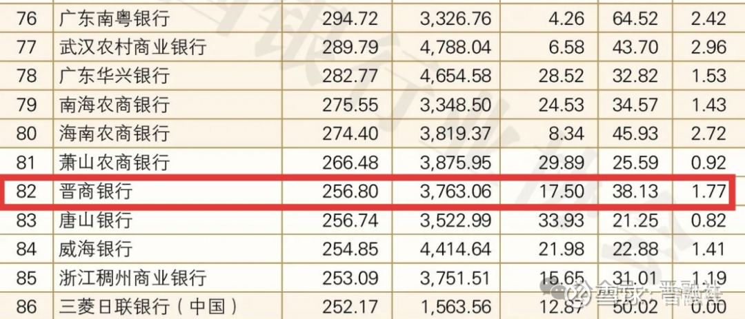 2025年度“中国银行业前100名单“显示,晋商银行核心一级资产净额为256.80亿元,资产规模为3763.06亿元,净利润为17.50亿元,成本收入比是38.13%,不良贷款率为1.77%。
