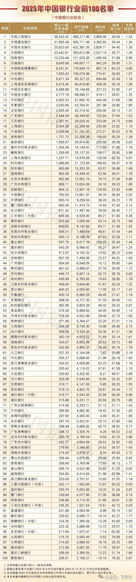 该名单是中国银行业协会基于监管部门对商业银行资本计量的相关要求,该名单按照核心一级资本净额对商业银行进行排序,并对各家银行的经营规模、盈利能力、运营效率及资产质量进行综合展示。