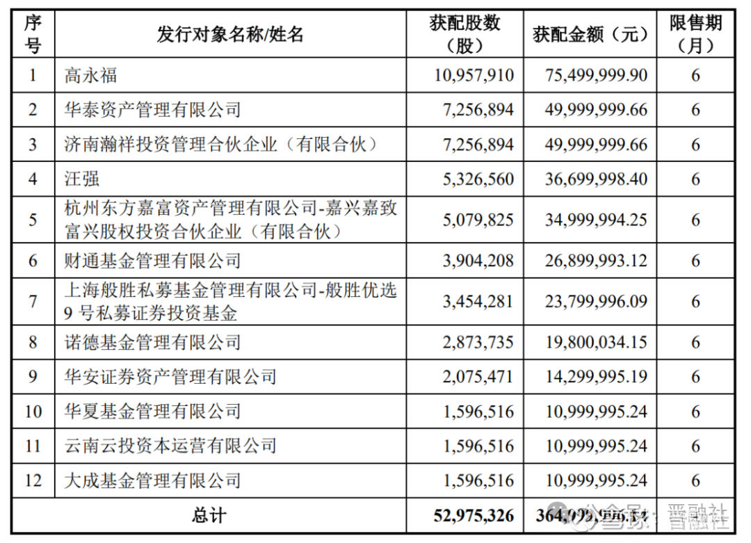 认购对象为10家专业投资机构,两位为自然人,共计发行5297.75万股,限售期为6个月。