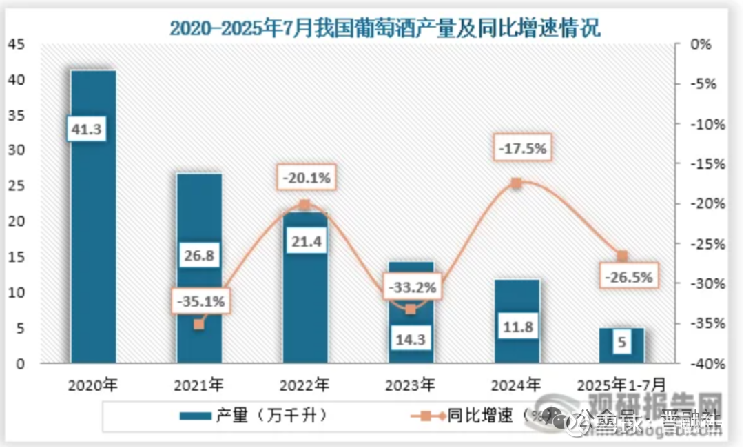 从产量来看,2020年到2024年我国葡萄酒产量持续下降,到2024年我国葡萄酒产量为11.8万千升,同比下降17.5%,创阶段新低,盈利水平不及白酒行业。今年以来,国内葡萄酒行业颓势仍在延续。