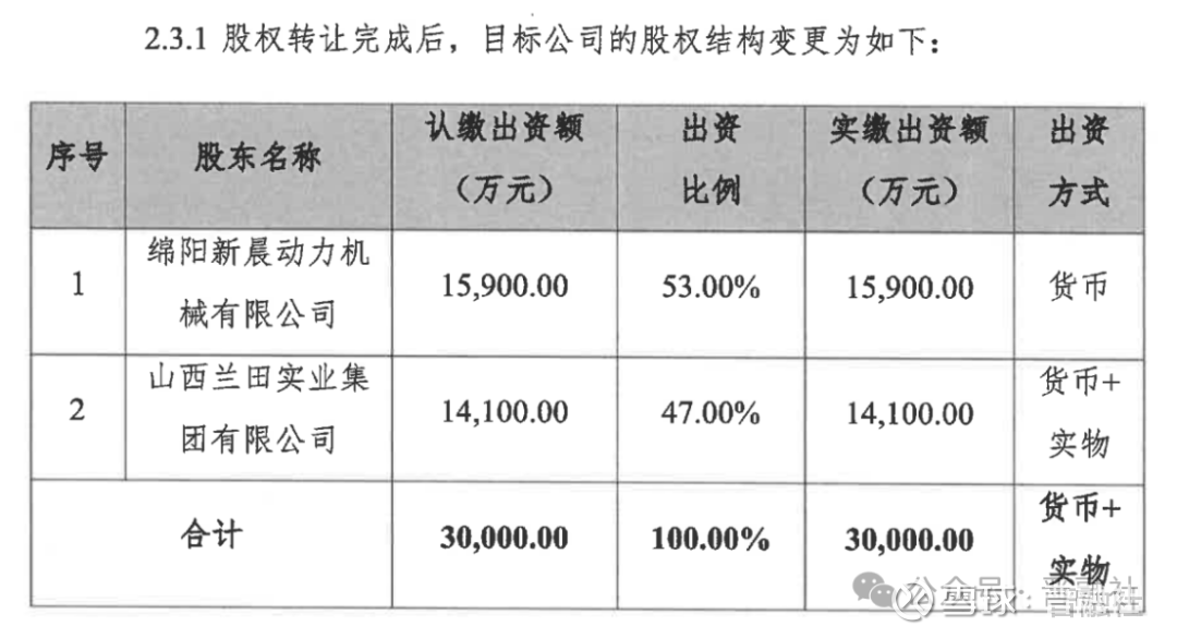根据收购方案,新晨动力先通过全资子公司绵阳新晨动力机械有限公司(以下简称绵阳新晨),出资4886.48万元获得中航兰田53%股权,对应注册资本为1.59亿元。蓝田集团对中航兰田持股比例由100%变更为47%,对应注册资本为1.41亿元。