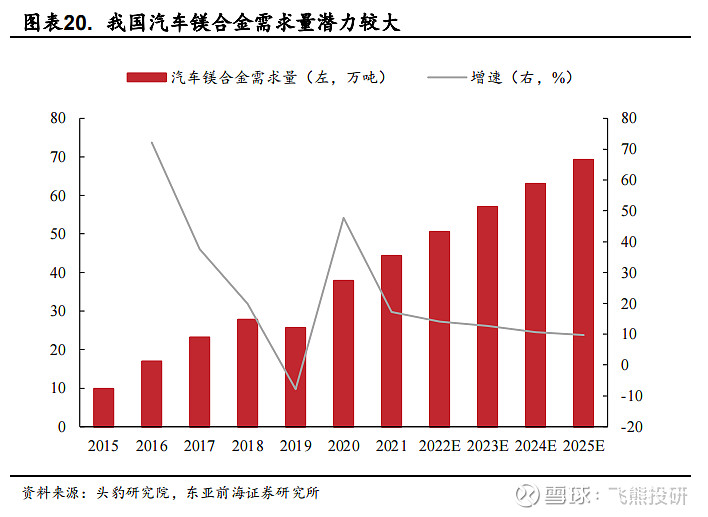 根据《节能与新能源汽车技术路线图》,2025年单车含镁量要达到25kg,2030年要达到45kg。随着国内镁合金市场生态不断成熟,镁合金生产技术不断提高,单位成本逐步下降,我国单车用镁量将持续提高,镁合金的需求量有望大幅度增加。