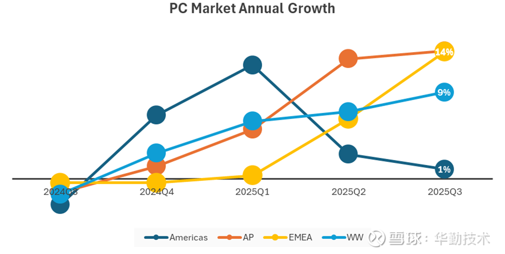根据IDC,2025年Q3全球PC出货量同比增长9.4%,总量达7580万台。此增长态势符合市场预期,表明在Windows 11升级与老旧设备换新潮的推动下,PC市场正保持稳健活力。