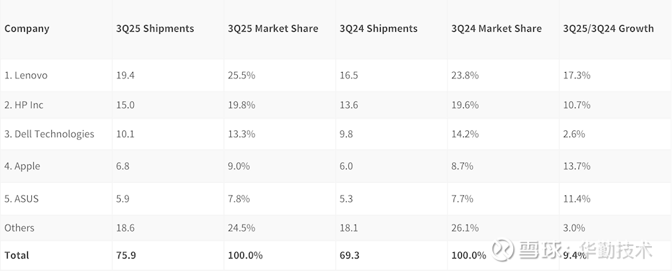 2025Q3五大公司全球PC出货量、市场份额及同比增长率 (出货量单位为百万台)