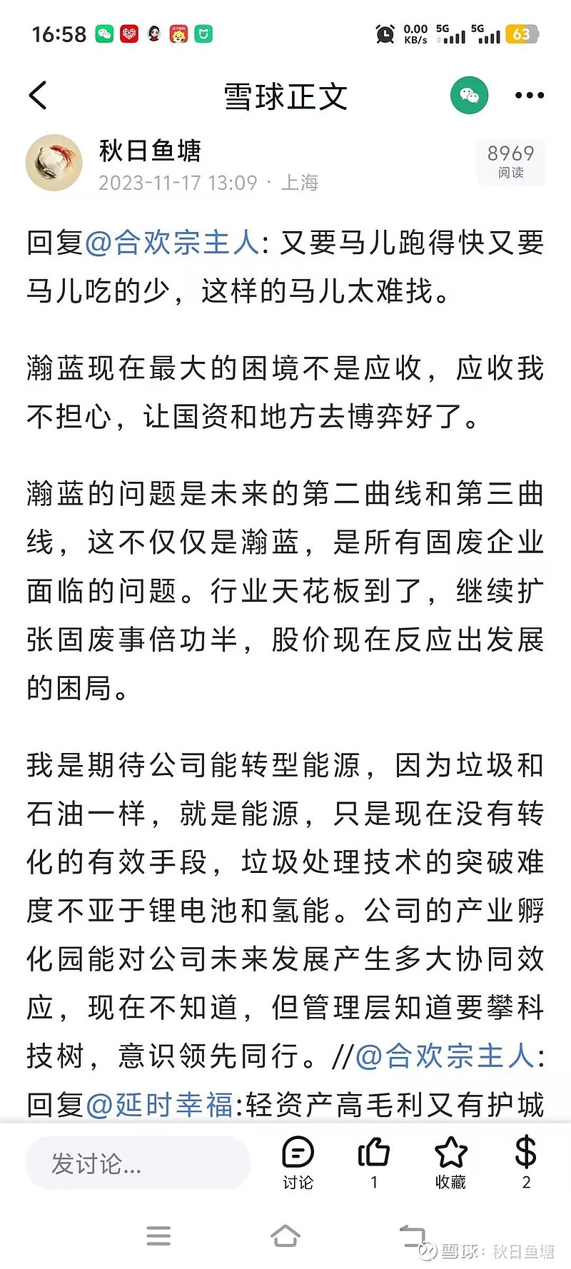 昨天聊的时候也说到了公司新成立的瀚蓝(深圳)能源有限公司,成立这个公司的目的是什么,公司表达的挺清楚的“以固废处理为核心,向能源服务延伸”,说白了就是逐步向能源公司转型。23年的发帖时就说过,公司的未来是向能源公司转型,以绿色能源为出发点建立第二、第三增长曲线,公司正在脚踏实地的实践中,个人感觉未来可期。