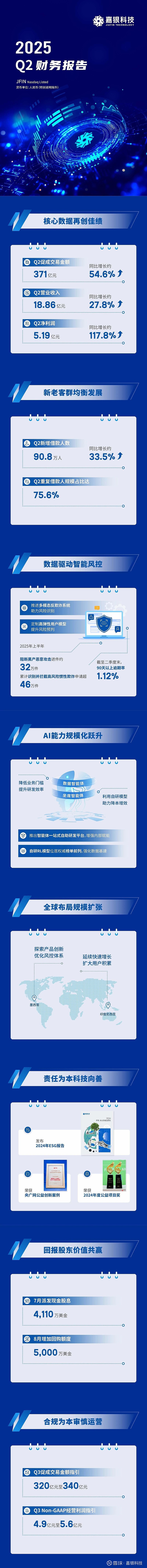 (NASDAQ: JFIN)发布2025年第二季度未经审计的财务报告。本季度,嘉银科技持续推进“AI+”战略,赋能业务平稳运行。